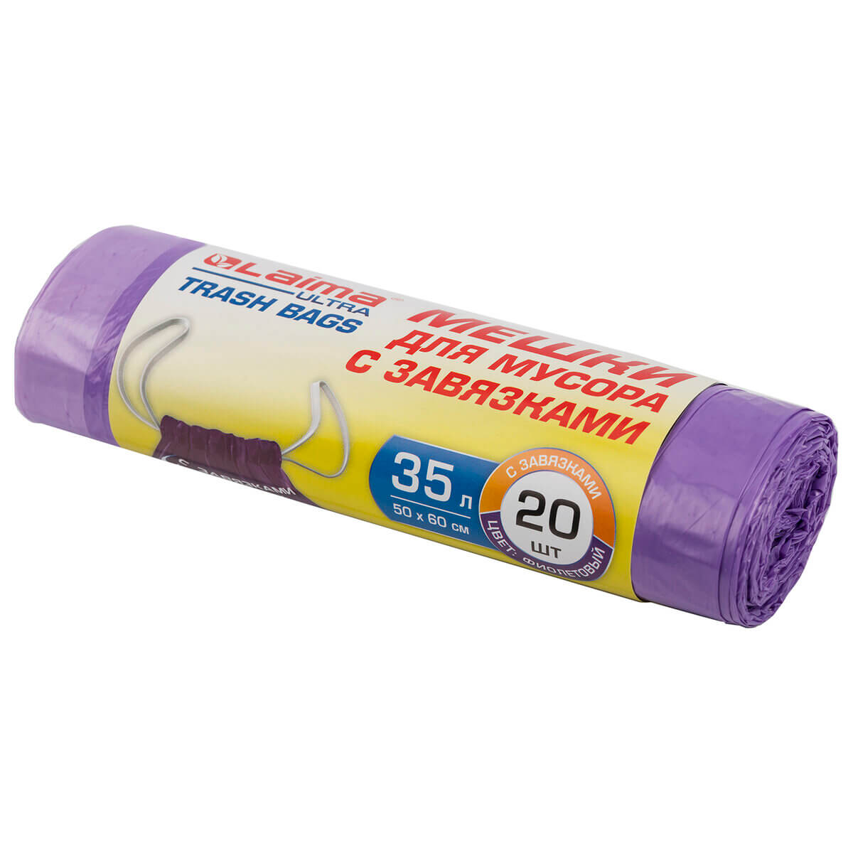 Мешки для мусора 35 л, с завязками, фиолетовые, в рулоне 20 шт., ПНД, 13 мкм, 600х500 мм, LAIMA ULTRA, 607685